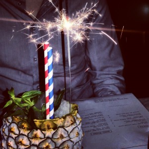 I had commented on The Powder Keg’s photo on Instagram that day about us coming for our anniversary dinner, and had received a response to say we should tell Martin. I had no clue who this Martin fellow was, so had to ask the waiter, who pointed out a man in a black waistcoat near the kitchen. I mentioned it to him, but he already knew, and I still don’t know how. We each chose the TPK Jaffa for dessert. It was like a deconstructed jaffa cookie (the ones from the UK), with chocolate mousse, brownie pieces and dehydrated pieces of orange.When our dessert arrived, we each were amazed to find the words “Happy Anniversary” adorning our plates in chocolate. And when that wasn’t a surprise enough, Martin produced a pineapple with the top cut off with two straws and a sparkler in it! Something was bubbling over the side of the pineapple, and we found out it was a complimentary cocktail for our anniversary. The pineapple had been scooped out, and dry ice had been placed inside the empty fruit. Dark rum, apricot liqueur, bitters, fresh passionfruit and overproof Rum float were the ingredients used to make this awesome concoction. Bubbles were spitting out over the top of the pineapple, so of course it was aptly named the Volcano Punch.